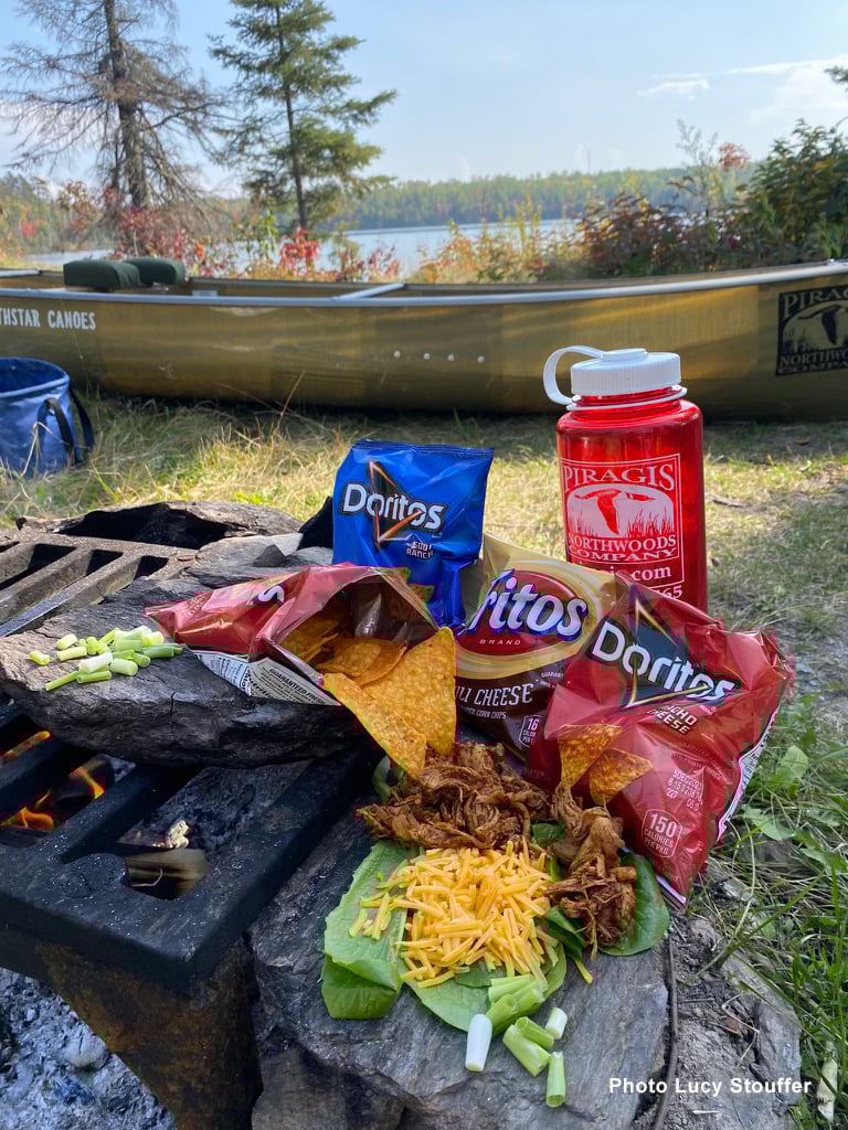 Pro Tip #2: For these tacos in a bag buy your favorite salsas at home and transfer them from glass jars into small plastic Nalgene bottles. Salsa is a fantastic condiment to pull out of your food bag in the wilderness. It will also turn scrambles eggs and fresh walleye filets into a 5 Star Northwoods breakfast. Bring rice and beans along either pre-made and frozen, packed in zip locks or any rice and beans camp meal — pair with tortilla chips and eggs and you’ve got homemade campfire Huevos Rancheros.