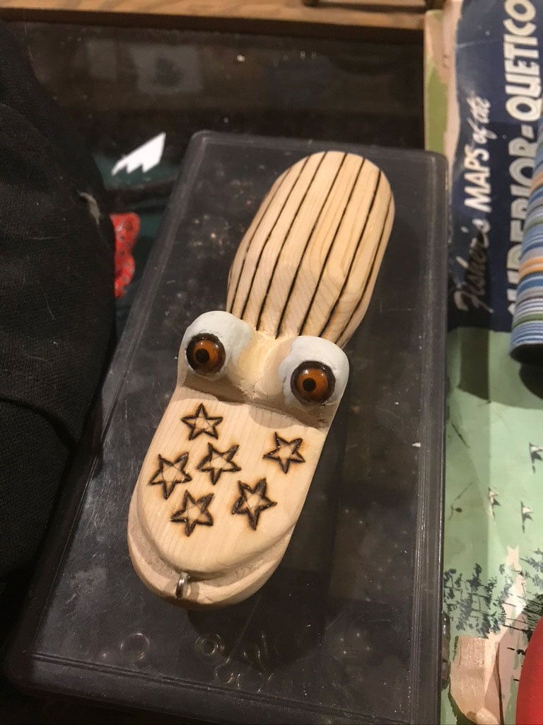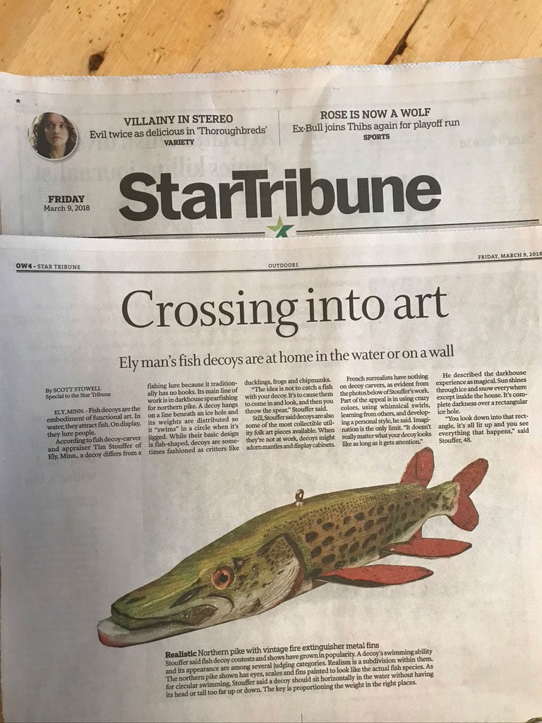 Several years ago, the Minneapolis Star Tribune published an article about my creations and collections. I was surprised to find out that many people in Minnesota (let alone other parts of the country) had never heard of Darkhouse Spearing and fish decoys. They’d never sat over a big hole in the ice in the dark and watched Northern Pike swim in because they were curious of a swimming fish decoy. They were admirable of the functional sport as an art form though and as something to be collected and displayed at cabins or homes.