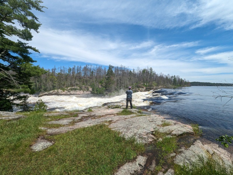 Zach and I stopped at the first site on Kawnipi Lake after departing the falls chain, greeted by an old Bell canoe that had been torn to shreds in the falls chain and discarded at the site below – a testament to the destructive capacity of water flowing from one massive body of water into another.