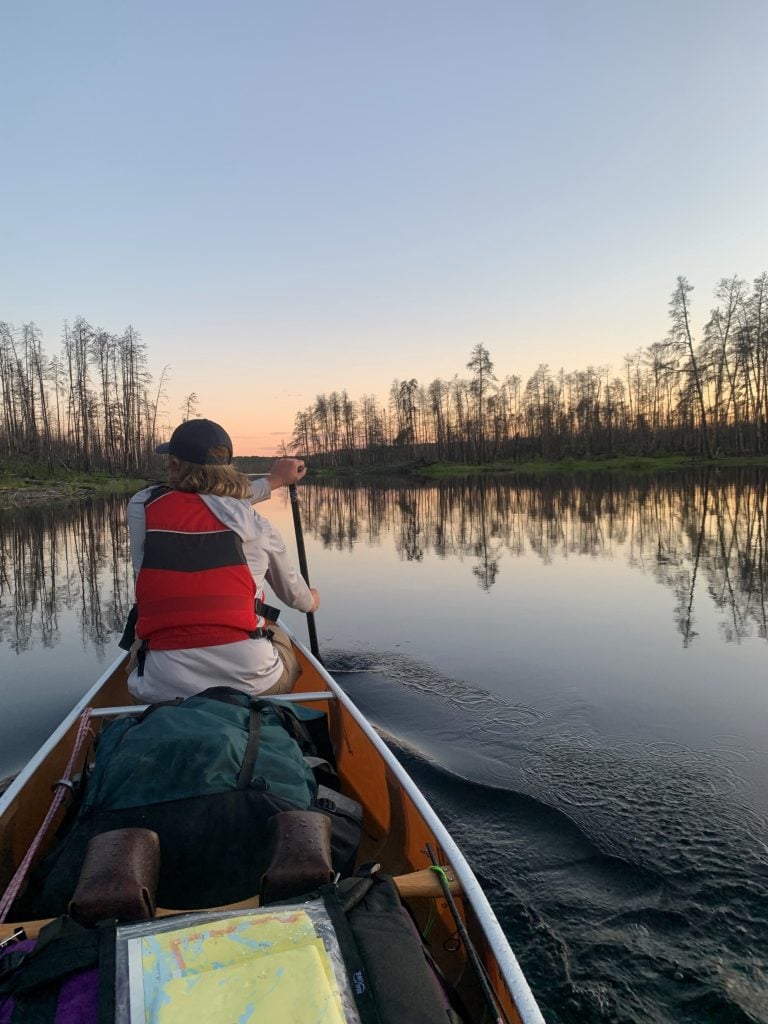 We stayed at the campsite for 2 hours, most of the time I laid prone on top of cedar pine needles trying to give my hip flexors and tight glute muscles a brief rest. Back on the water we paddled down my favorite lake, Kawnipi, all afternoon into the evening. The wind came down for us and we finished our day’s paddle gliding over glassy water through the freshly burned western edge of Kawnipi in the twilight, again having to maneuver around high moving water, elusive in the low light, once portaging through a game of pickup sticks comprised of massive fallen pine trees, a great place to break a leg, and then running some rapids onto Shelley Lake, where we set up camp in the dark and slept for a few hours on an island.