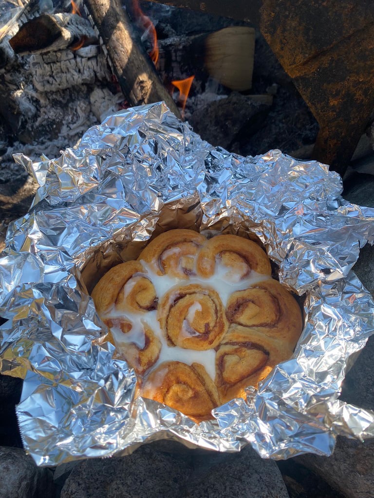 These cinnamon rolls were right off the shelf at the grocery store in the cardboard roll. They came with their own frosting pack and cooked easily in a cooking kit pot with foil. French press coffee and campfire bacon and fresh baked rolls… what a combo!