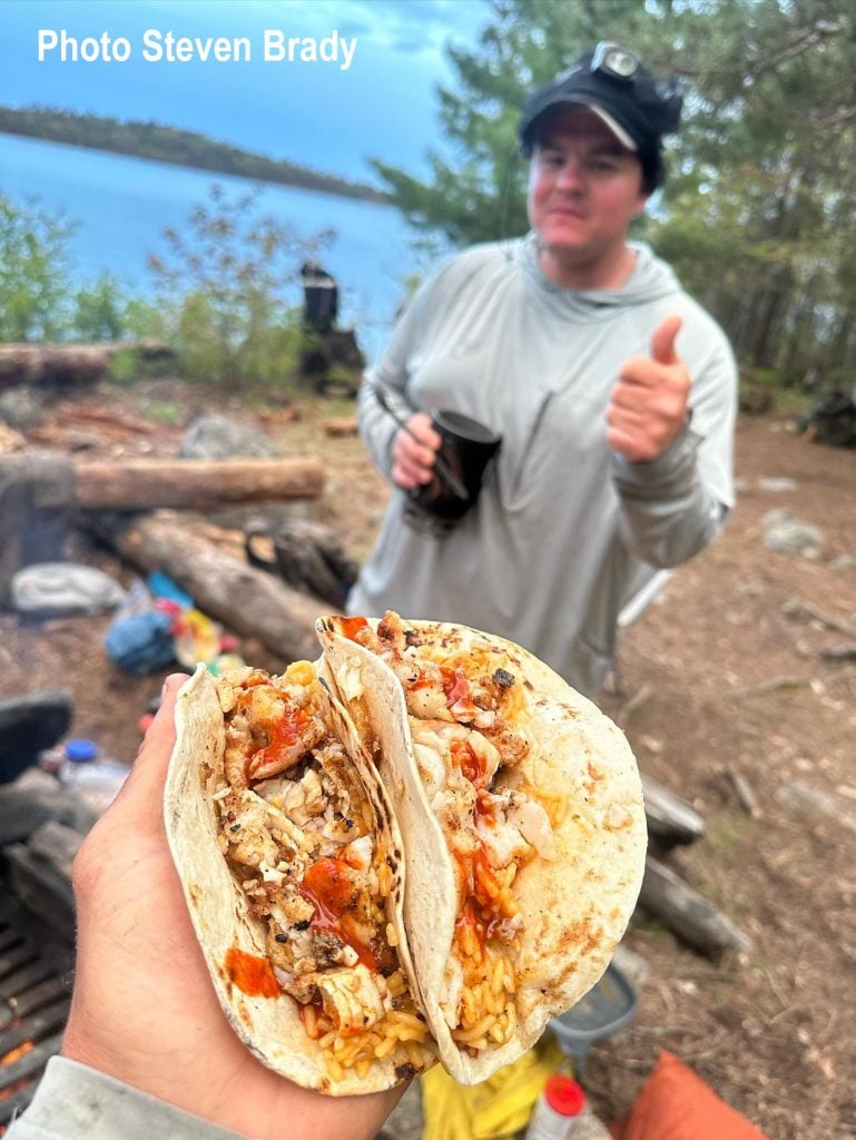 I come from a big line of bread makers and my wife and daughter carry on that tradition. If you love bread, you can splurge with with space in your canoe camping menu pack by bringing a sourdough loaf from home. Open faced grilled beef sandwiches are a great canoe camping menu crowd pleaser for night one or two. If you haven’t guessed, we like to eat well after burning energy by paddling and fishing all day. Also the campfire is a place of comradery and fun where memories are made. Why not enjoy your meals! If you don’t have or enjoy homemade bread bring a bunch of tortillas, you can make street tacos with almost everything.
