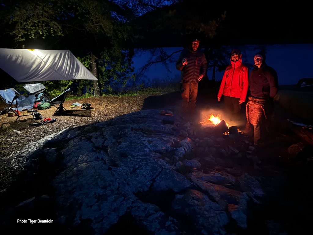 The sun set on us as we reached Twin Falls and we took an hour-long break before navigating the final rapids through a pinch point to Lac La Croix, following the rising bubbles of flood waters all the way out into the main lake. I’ve never encountered these rising bubbles before, but I will not forget how ominous they were, the only indication of heavy water flow below the canoe when we were in calmer areas between rapids or falls, like a cauldron bubbling over a fire, certain to obliterate anything deposited into it. I’m not sure what causes the bubbles, but they were unique to my experience, though constant on that day. I again laid prone for the entire break, smoked a little, and found a second wind (maybe a third or fourth) and we paddled to the southern end of Coleman Island, halfway down Lac La Croix, in the dark. There is something magic, albeit unnerving, about navigating a gigantic body of water in the dark – one can see the major landforms and judge his position accordingly, but he must constantly take stock of the shoreline, lest he loses track and paddles miles out of the way. At 1:30 am, after about three hours of paddling in the dark, we pulled into camp, and I fell asleep without eating.