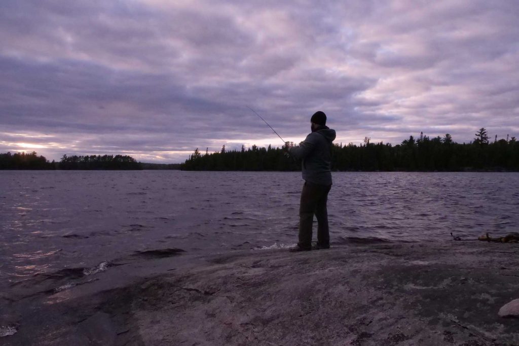 That evening we ventured about a mile to the Northwest and fished around the large island in the middle of Sunday Bay. It was still too violent in the wind to fish the high-percentage areas (windblown shoreline on the north side) so we fished just barely out of the wind, casting into the choppy water along the edges of the island. It was tough fishing, we did not find the numbers, but again, the fish we did find were larger on average. This time of year, 17-22” walleyes put up an incredible fight on a lightweight jigging rod. We had a blast catching 2-3 of these each before heading back to our campsite for a very small campfire and a shore lunch dinner. Again, we slept great.